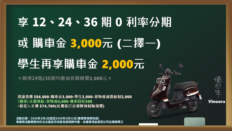 本網站所提供之線上分期,12、24、36期零利率 (24、36期均需加收分期開辦費2,000元計入首期繳款金額內) ※ 建議售價均已含領牌強制險,不包含電動車機種※