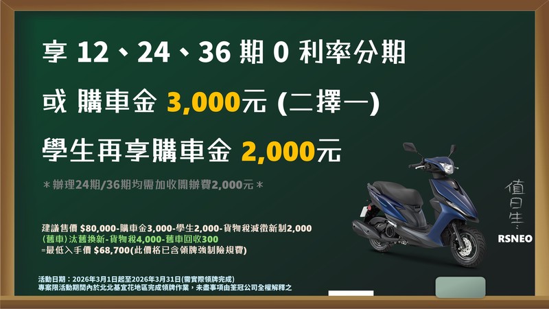 本網站所提供之線上分期,12、24、36期零利率 (24、36期均需加收分期開辦費2,000元計入首期繳款金額內) ※ 建議售價均已含領牌強制險,不包含電動車機種※