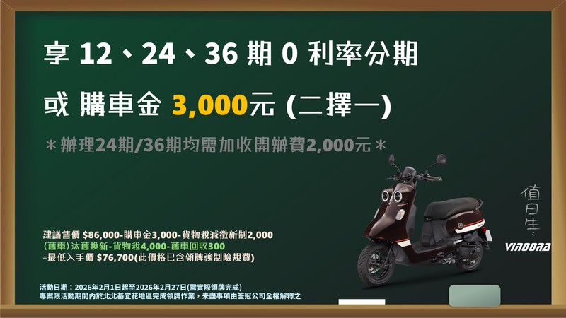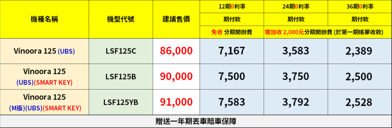 本網站所提供之線上分期,12、24、36期零利率 (24、36期均需加收分期開辦費2,000元計入首期繳款金額內) ※ 建議售價均已含領牌強制險,不包含電動車機種※