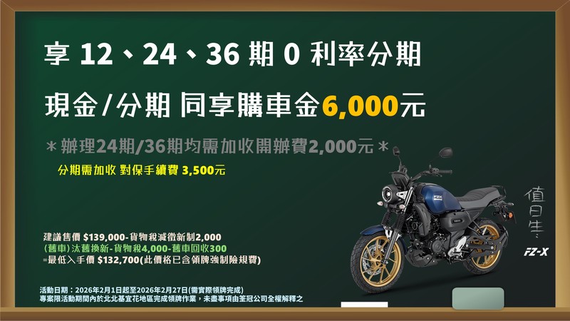 本網站所提供之線上分期,12、24、36期零利率 (24、36期均需加收分期開辦費2,000元計入首期繳款金額內) ※ 建議售價均已含領牌強制險,不包含電動車機種※