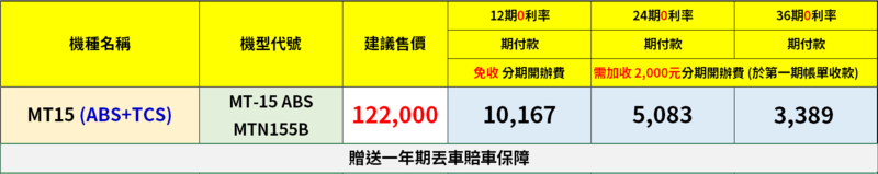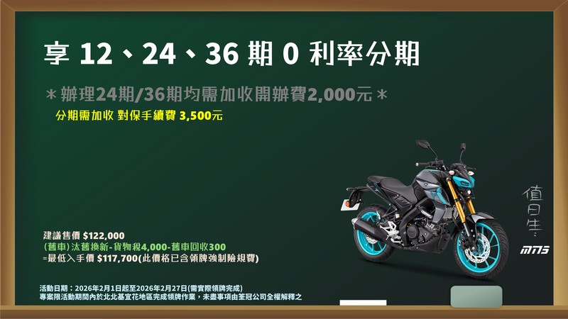 本網站所提供之線上分期,12、24、36期零利率 (24、36期均需加收分期開辦費2,000元計入首期繳款金額內) ※ 建議售價均已含領牌強制險,不包含電動車機種※